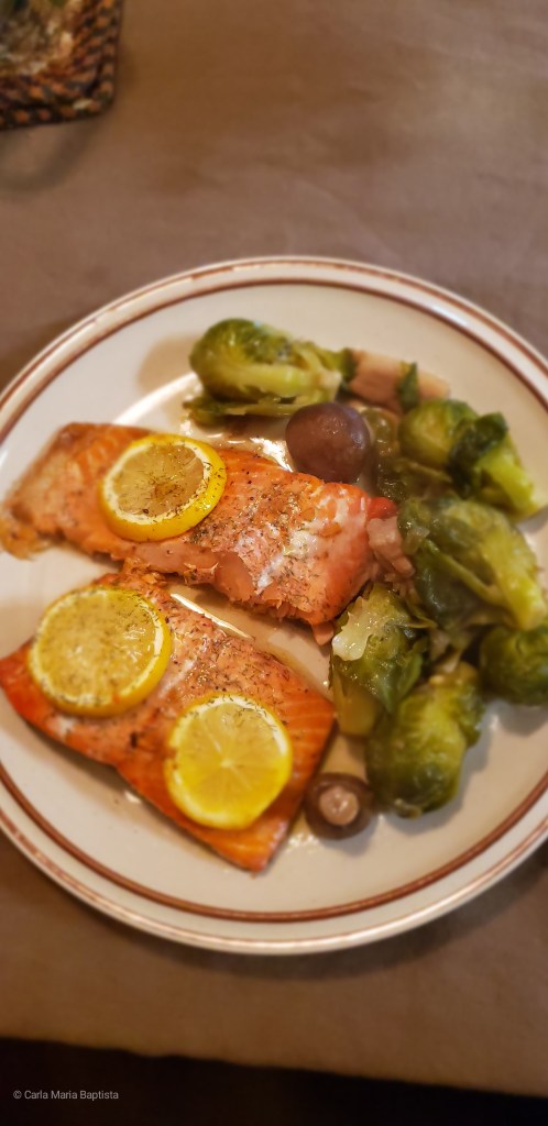 Salmao com Couves de Bruxelas e Cogumelos