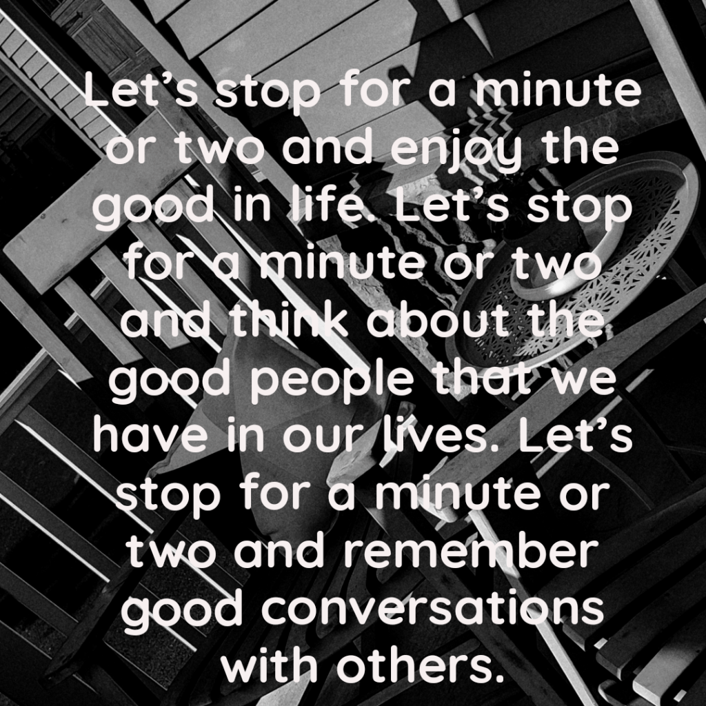 Vamos parar por um ou dois minutos e apreciar o que há de bom na vida. Vamos parar por um ou dois minutos e pensar nas boas pessoas que temos na nossa vida. Vamos parar por um ou dois minutos e recordar boas conversas com os outros.
