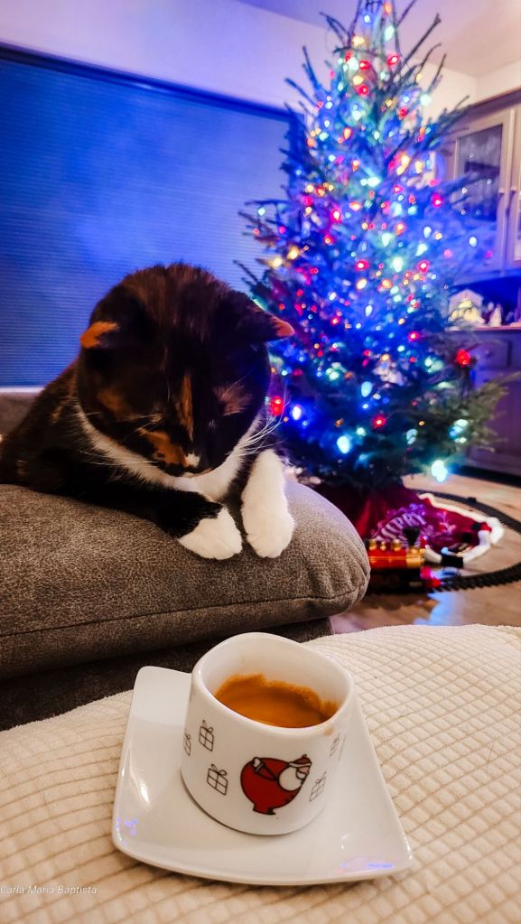 Ah, the season of sparkle and cheer draws to its gentle close, and soon, the trinkets and treasures will be tucked away. Among them, this tiny espresso cup—a relic of my hooman’s past, a cherished keepsake from her mommy. It sat quietly, yet proudly, amidst the flurry of festivities, whispering stories of a time before me.