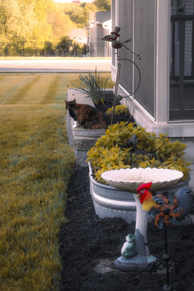The yard has changed a little. Luckily there are plenty of hideouts: dense bushes near the fence line, a few patches of ivy, and a once-lovely little tree out front (RIP) that we still visit out of respect, the small tree didn’t make it through the winter—it stood bare for a while, then faded altogether. But the bushes remain, thick and whispery, perfect for hiding when the wind picks up or Smores is on patrol. We lost a lookout, but the ground cover holds secrets of its own.