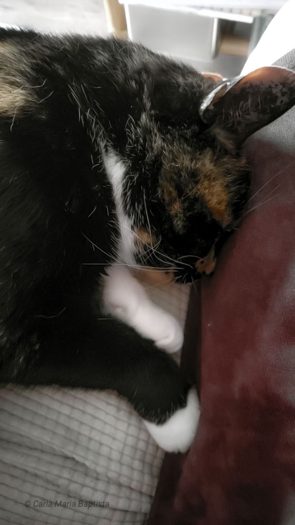 Alguns chamam a isto carinho. Outros dizem que é confiança. Mas entre nós? É posse. Ela é minha. Minha almofada (perna, neste caso). Meu lugar seguro. Minha humana.