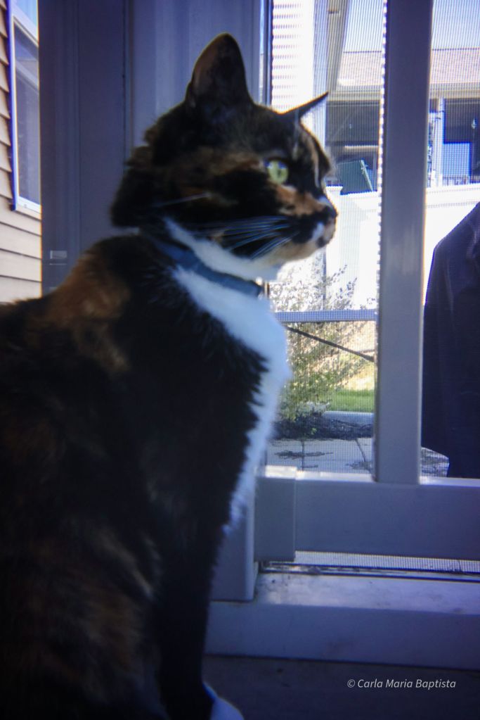 Mommy had just returned home. The door to the fence (you may call it a screen door, but to me it is a barrier most noble) was opened. I was there at my post, recounting the day’s chronicles: the spider who took up residence on the porch last night, the passing of automobiles, the subtle shifting of the wind—matters of great consequence to a cat of observation.