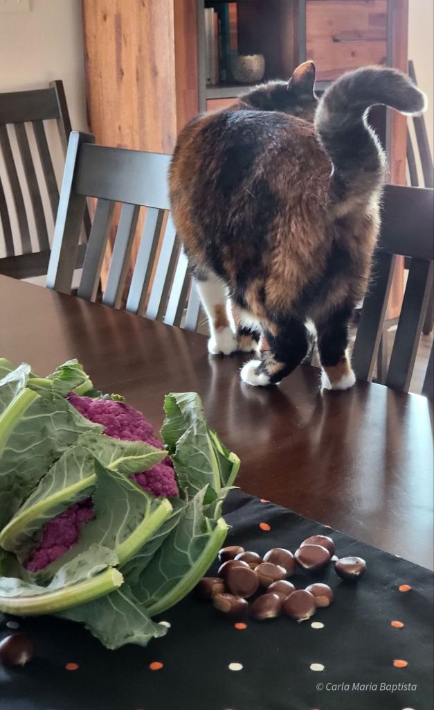 E então — oh, então! — encontrei outra curiosidade. Uma coisa redonda e roxa que parecia saída de um jardim real. A Mamã chamou-lhe “couve-flor”. Dei-lhe uma cheirada delicada. Bonita, sim. Real até. Mas sinceramente? Não rola, não salta, e muito menos chia. 10/10 em aparência, 0/10 em diversão.