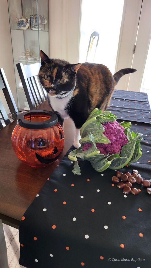 And then — oh, and then! — I found another curiosity. A round, purple thing that looked like it belonged in a royal garden. Mommy called it “cauliflower.” I gave it a delicate sniff. Gorgeous, yes. Regal even. But honestly? It didn’t roll, it didn’t bounce, and it certainly didn’t squeak. 10/10 for looks, 0/10 for fun.