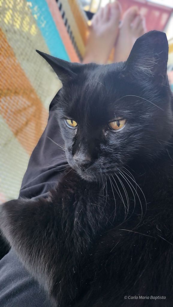 O Jack percebeu imediatamente, que eu não me sentia bem. Aproximou-se do alpendre coberto, o pelo negro a brilhar como luar num tesouro secreto. Mamã, olha! Ronronou docemente, O sol está a dançar no alpendre! Tens que vir vêr! Vamos até ali, até à rede! Está tudo bem, mesmo que o teu estômago esteja a conspirar contra ti!