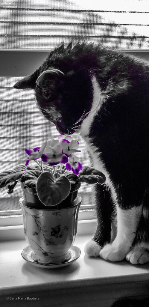 Ah, but then there’s the African Violet — the jewel of the window sill. She stands alone, regal, and fragrant. I tell myself to behave, I truly do… but those purple petals, those scents, they simply leap into my mouth! What’s a lady to do?