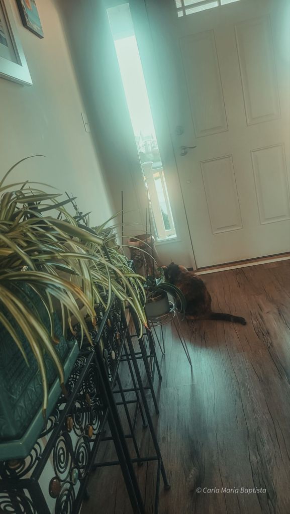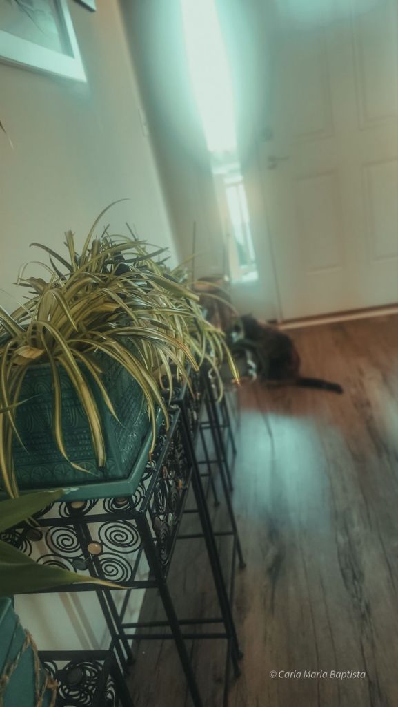 Durante o dia, quando a Mamã não está, passeio pela minha selva, movendo-me entre folhas e raios de sol, qual criatura refinada que sou. O meu favorito, claro, é o Clorófito, a famosa planta-aranha. Há qualquer coisa nela… um je ne sais quoi que me inspira! Um pequeno arrepio, um toque de mistério.