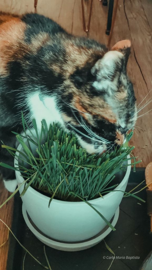 O meu oásis privado espera-me: o átrio, qual uma selva doméstica, exuberante, perfeitamente pensada e cuidada. É aqui que vivem os melhores exemplares, incluindo a minha erva para gatos, trocada semanalmente, como deve ser. Afinal, há que manter o nível.