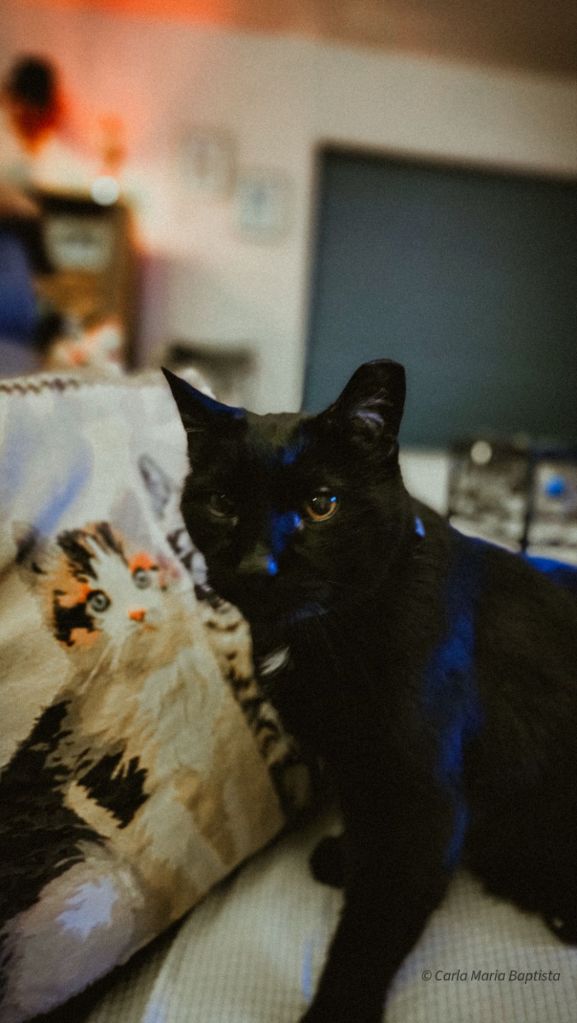 Mas algo misterioso aconteceu na última semana de Outubro. Um a um, comecei a reparar em pequenos gatos pretos a aparecer por todo o lado. Um dispensador de sabão aqui, um suporte de velas ali, uma estatueta na prateleira… até havia um mesmo ao lado da minha tigela da comida, a olhar para mim como se fosse um guardião silencioso.