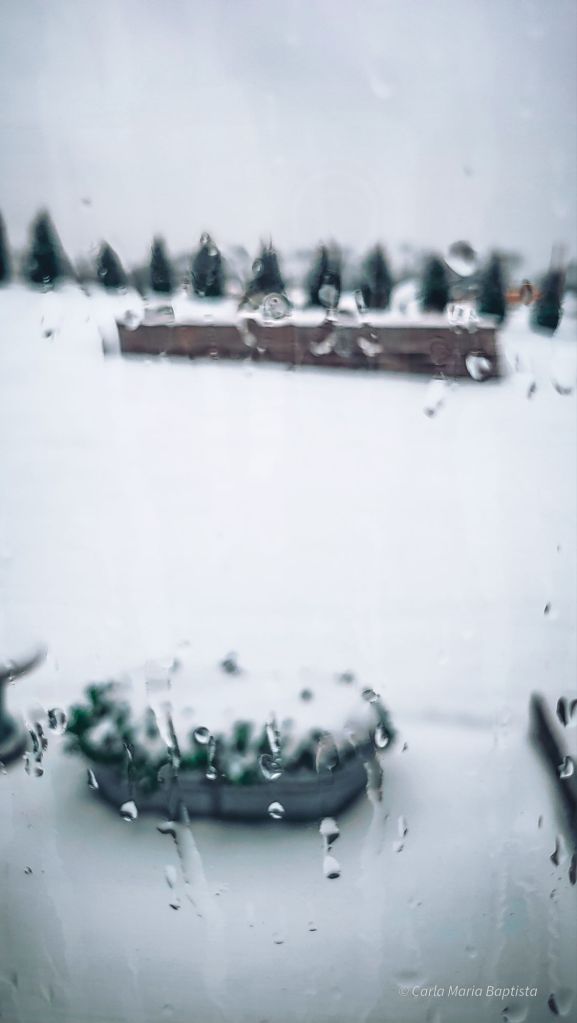 E alguém me pode explicar o que há tão especial num dia de neve? A neve é fria, cobre tudo o que é sítio decente, esconde toda a relva que eu gosto de trincar e, quando ponho as patinhas lá fora, volto para dentro como se tivesse tomado um banho dentro de um congelador. E agora, para cúmulo dos cúmulos, está a chover em cima da neve, o que significa que mais logo tudo isto vai transformar-se em pistas de gelo. Maravilhoso. Mesmo. Bah humbug!