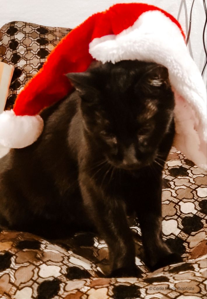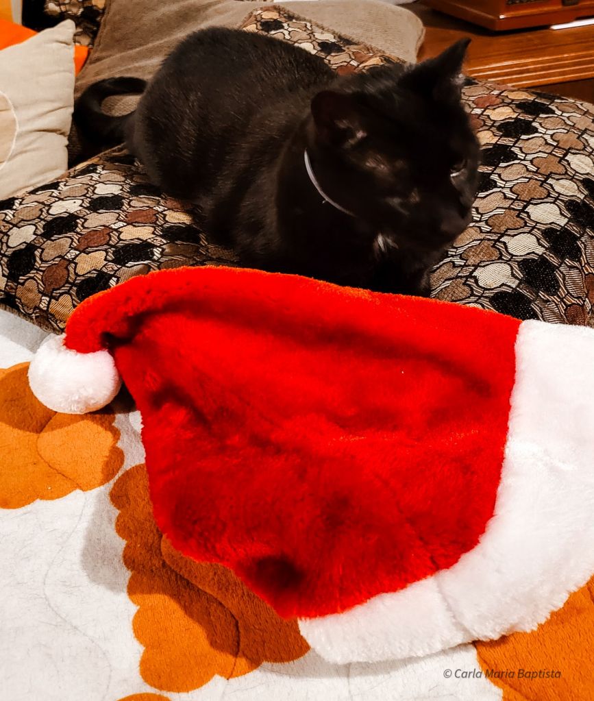 Claro que experimentei logo o chapéu. E sabem que mais? Nasci para isto. Se existisse um Pai Natal gato, bem… não procurem mais: seria eu! A Smores pode ganhar todos os prémios de fotogenia, mas quando se trata do espírito do Pai Natal, eu tenho o estilo, o charme e, sejamos honestos, a voz. (Escutem bem… Ho Ho Ho!)