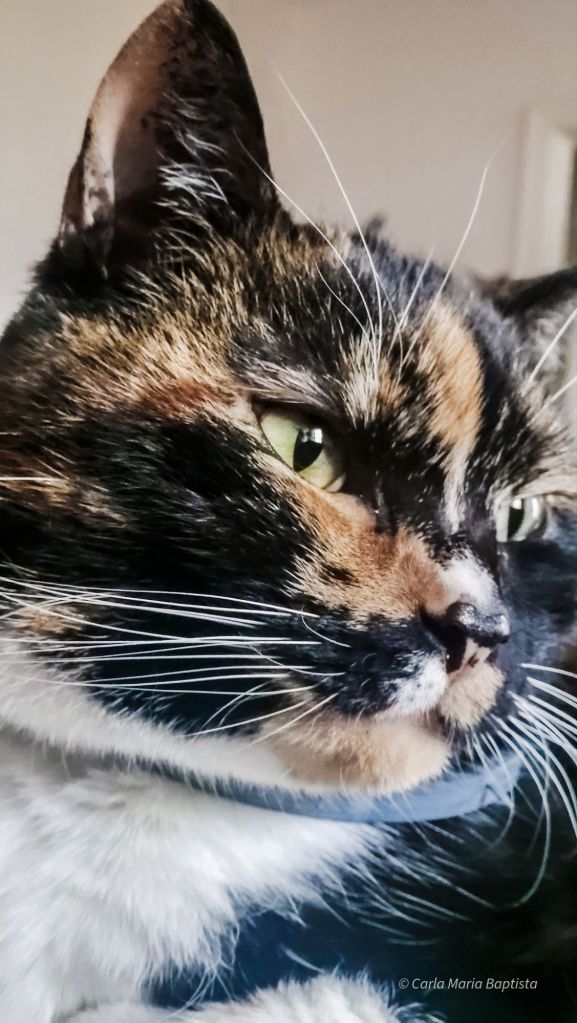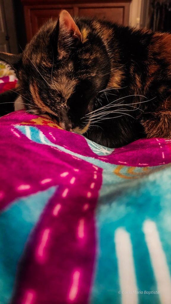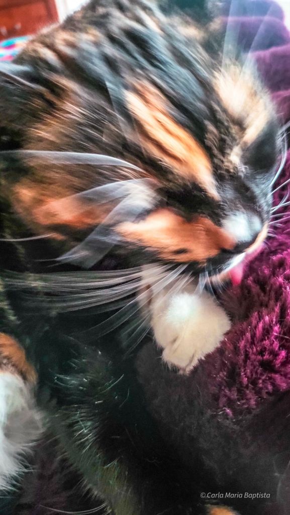 Quando os zoomies acabaram e chegou mesmo a hora de me acalmar, ajeitei-me com toda a graça no colo da minha humana e comecei a minha rotina nocturna de beleza. Patas limpas. Cara lavada. Bigodes perfeitamente alinhados. Nunca se deve ir dormir despreparada.