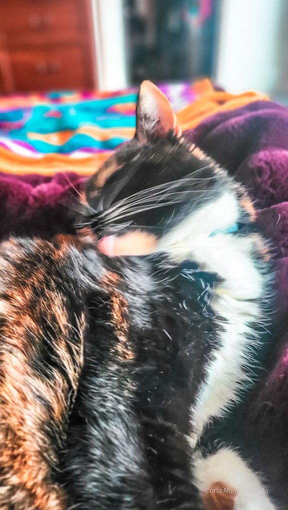 When the zoomies were done and the time truly came to settle, I gracefully arranged myself on my human’s lap and began my nightly beauty ritual. Paws cleaned. Face washed. Whiskers perfectly adjusted. One simply must never go to bed unprepared.
