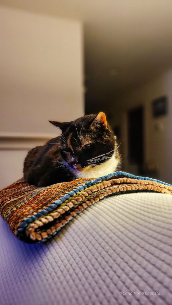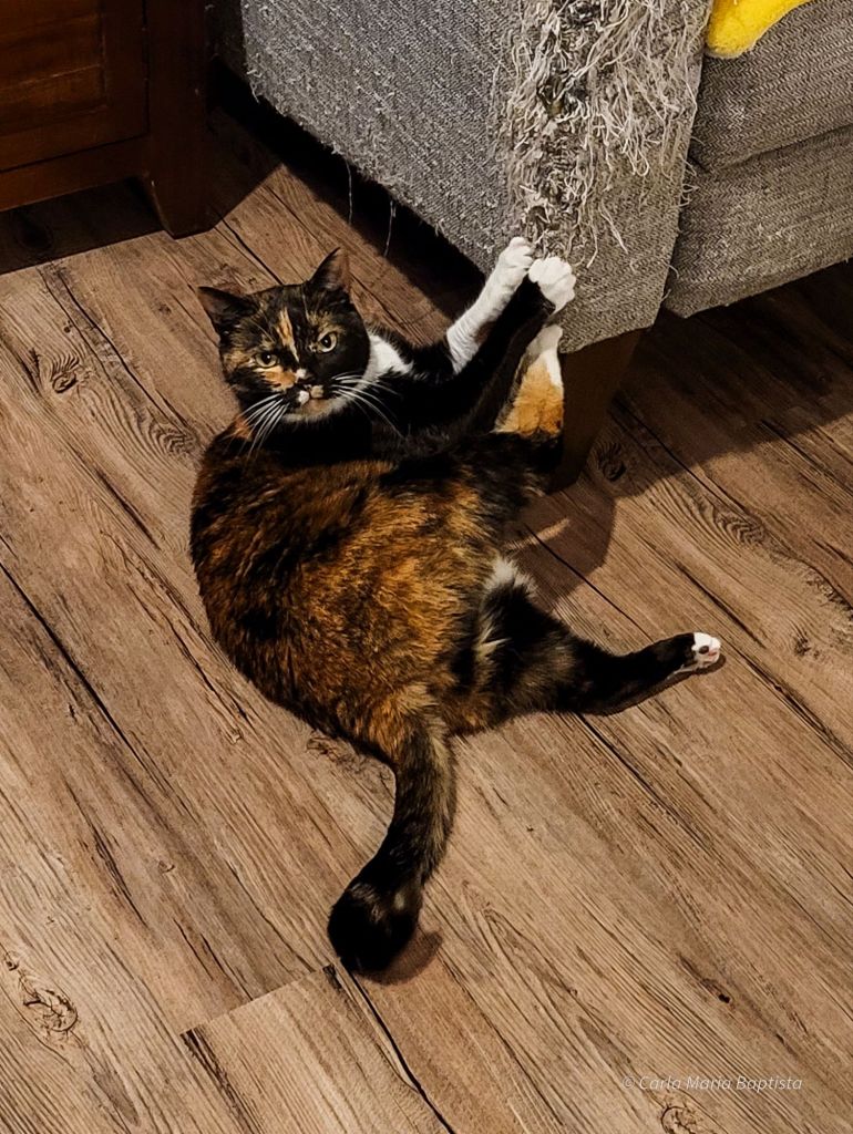A mamã e eu brincámos — porque brincar é bom para a alma e uma excelente maneira de lembrar os humanos os seus deveres. Quando me senti finalmente cansada, conquistei o meu trono: as costas do sofá, o lugar perfeito para supervisionar o meu reino enquanto pareço irresistivelmente elegante.