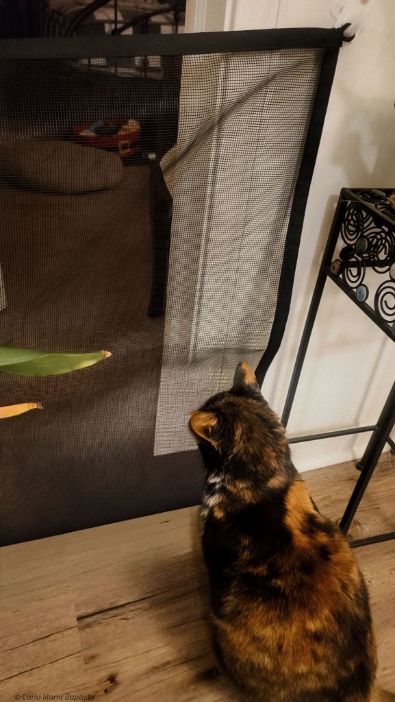 Ainda não havia a rede divisória, apenas corredores e divisões cheias de memórias, com num frágil equilíbrio. Uma noite, enquanto eu estava deitada na cama com o Jack (ainda incerto do seu lugar neste novo mundo) a Smores entrou silenciosamente no quarto. Não correu, não avançou. Moveu-se com intenção, saltou para a cama e sentou-se do meu outro lado. Ficou apenas alguns minutos. Tempo suficiente para reconhecer a mudança, talvez como a dizer “este já foi o meu mundo também”. Depois saiu a correr, como se tocar naquele momento fosse tudo o que conseguia suportar.