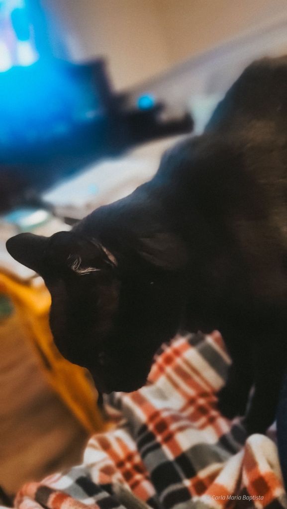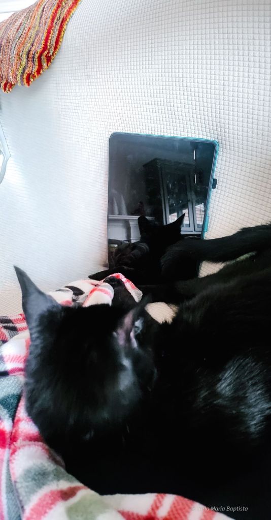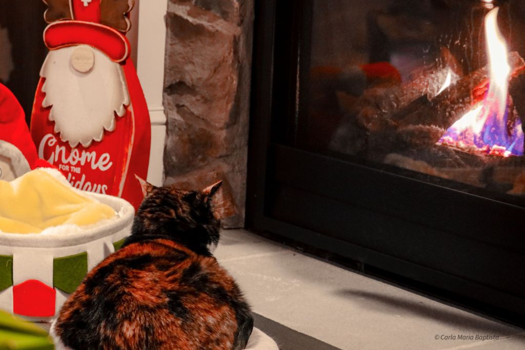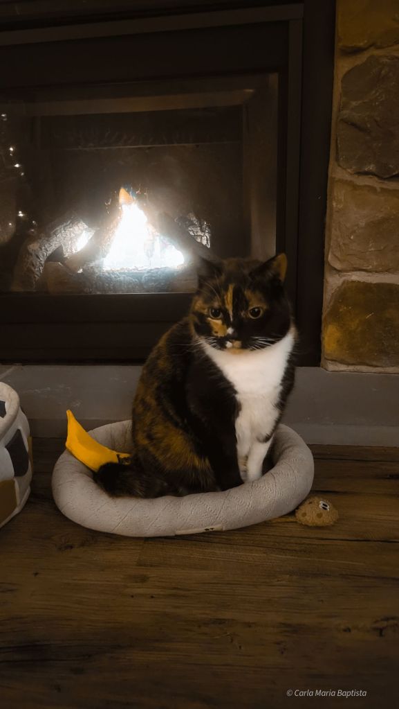 A Smores, claro, apoderou-se do melhor lugar mesmo à frente da lareira. Está ali plantada como uma antiga guardiã do calor. Não me importo muito. Lareiras são agradáveis, sim, mas a Mamã é mais quente. E faz festinhas atrás das minhas orelhas. Por isso escolho com sabedoria e aninho-me onde realmente importa.