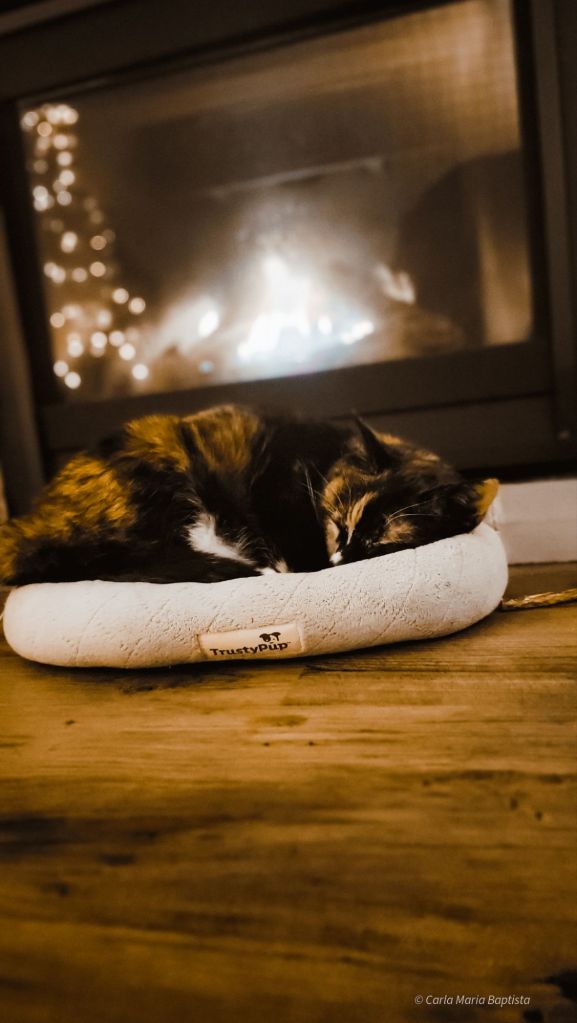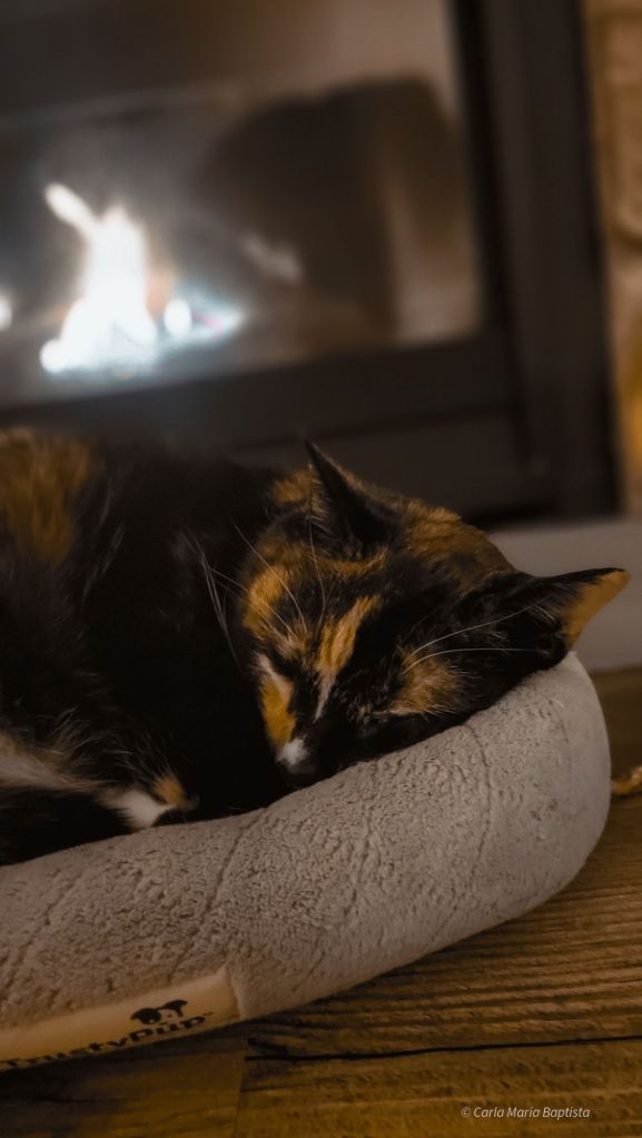 Smores is on her chosen throne in front of the fireplace. She selected it herself. Very official. Very queenly.