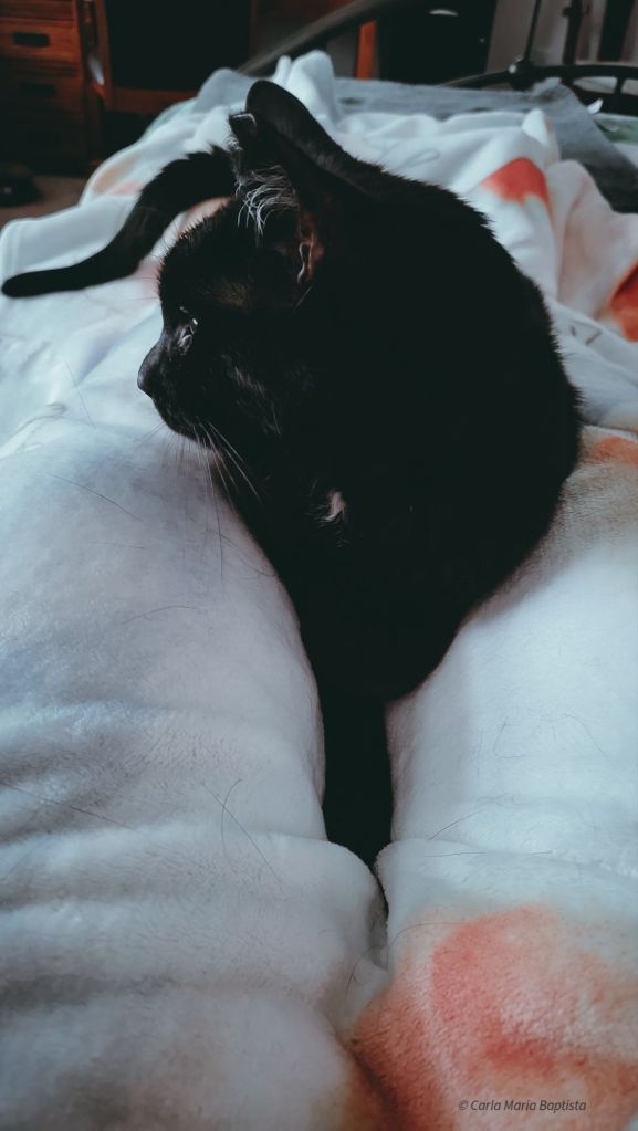 I have been requesting extra cuddles today (politely, but insistently). I called for Mommy until she came to the room, as she should. Now we are enjoying a movie and popcorn. Well—she is enjoying popcorn. I am enjoying my treats. Not popcorn. She would never. I am delicate. And regal.