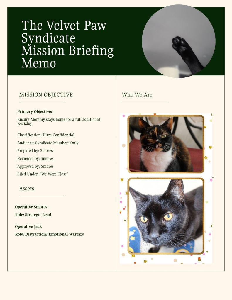 This time, Smores and I were aligned. Which, frankly, should have guaranteed success. History shows that when Smores and I cooperate, doors open. Treats appear. Reality bends.