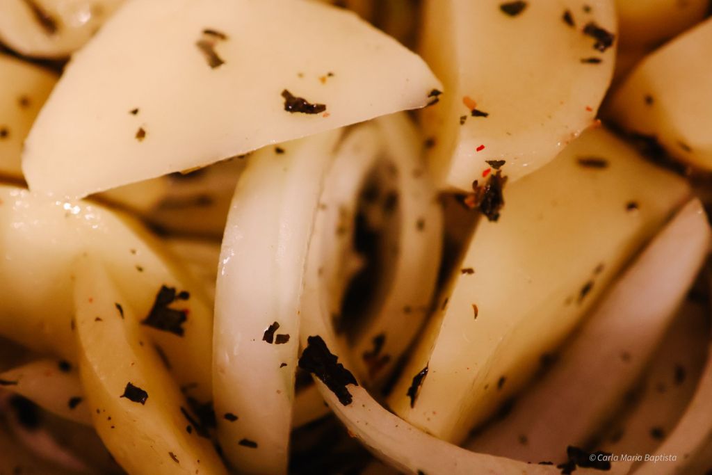 Cobrir bem o tabuleiro com folha de alumínio e levar ao forno durante 30–35 minutos. Esta fase permite que a cebola amoleça e que as batatas cozinhem, mantendo tudo suculento.