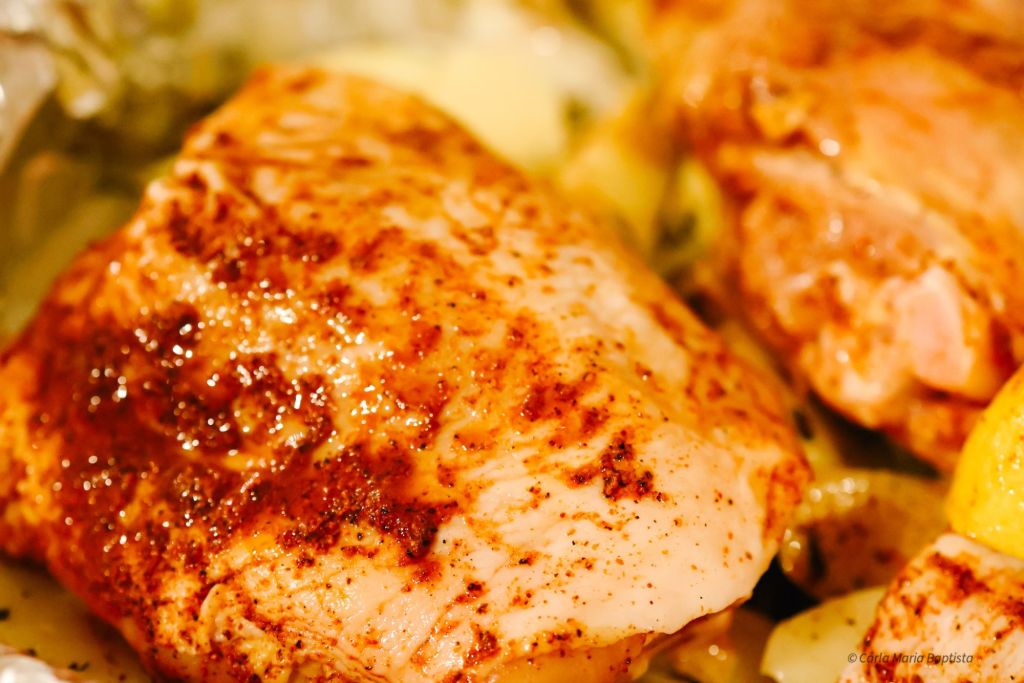 Coxas de Frango sobre Cama de Cebola e Batatas em Gomos