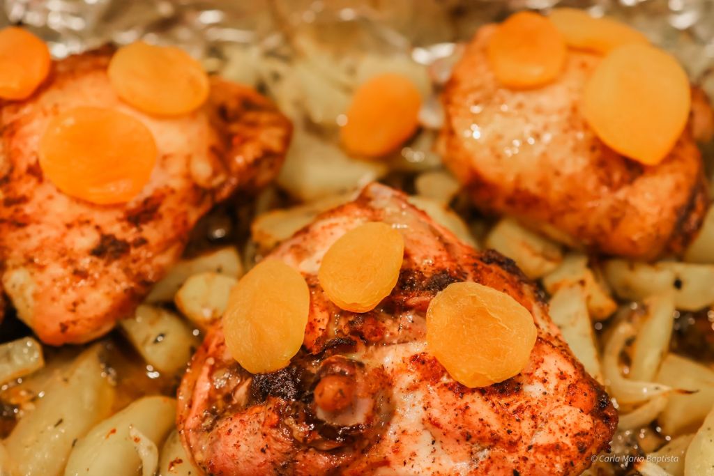 Nos últimos 5 minutos, distribuir os alperces secos por cima do frango para aquecerem e amolecerem ligeiramente.