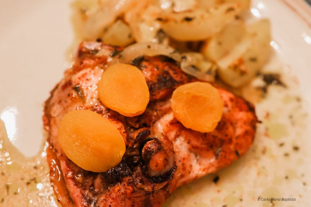 Os sabores intensificam-se. O alperce integra-se ainda mais no molho. As batatas absorvem o sumo cítrico e a cebola.