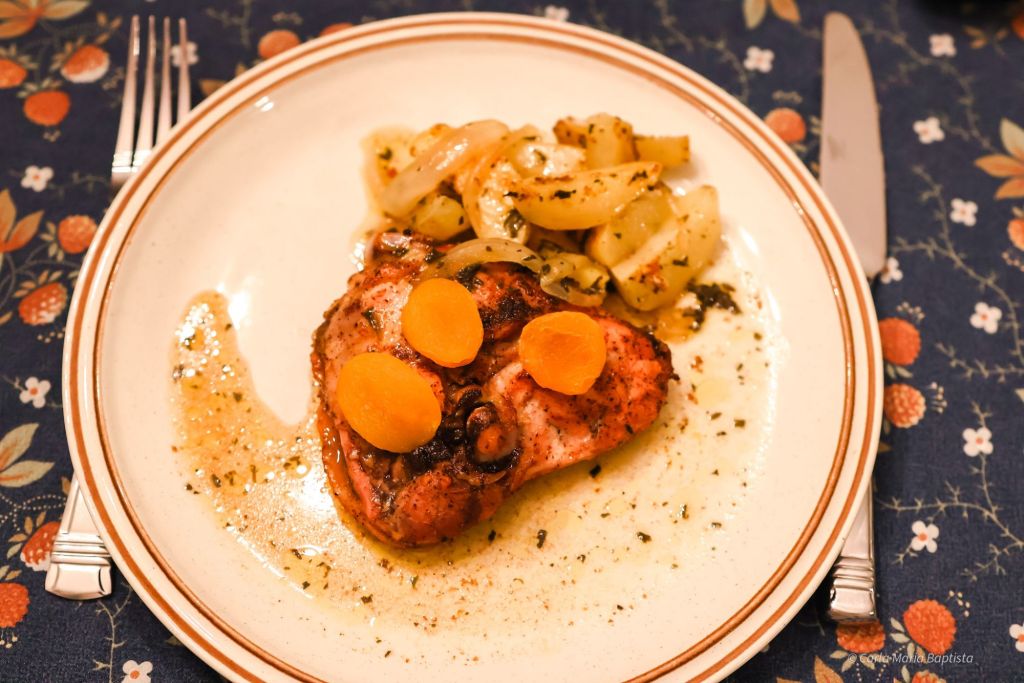 Lift each thigh and scoop from the bottom so you gather onions, potatoes, and pan juices together. Spoon that lemon-apricot jus over everything.